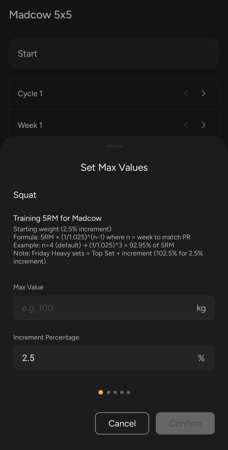 When you select Madcow 5x5 in the RepCheck app, it asks for your Training 5RM and increment percentage: