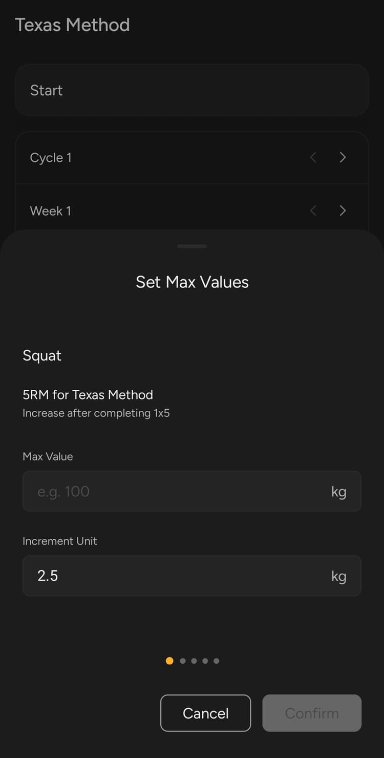 Enter your 5RM for Squat and Deadlift, your 1RM for Bench and OHP, and your 3RM for Power Clean. Squat and Deadlift increase by 2.5 kg automatically each week. Bench, OHP, and Power Clean stay at the same max until you adjust them manually — Bench and OHP after the 6-week mesocycle using one of the three progression options, and Power Clean after completing at least 4 out of 5 sets. The app calculates all Volume, Recovery, and Intensity Day weights — including the mesocycle percentages and warm-up sets.