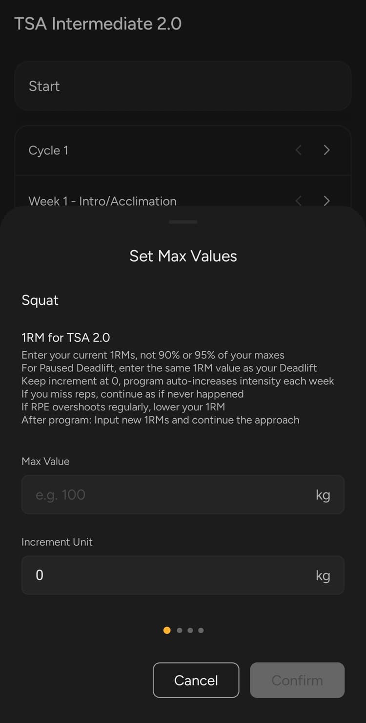 TSA programs require your actual current 1RM — not 90% or 95% of it. This is different from 5/3/1 and nSuns which use a Training Max. The program's internal percentages already start at submaximal levels (67–80% in Week 1), so entering a Training Max would make the weights too light.