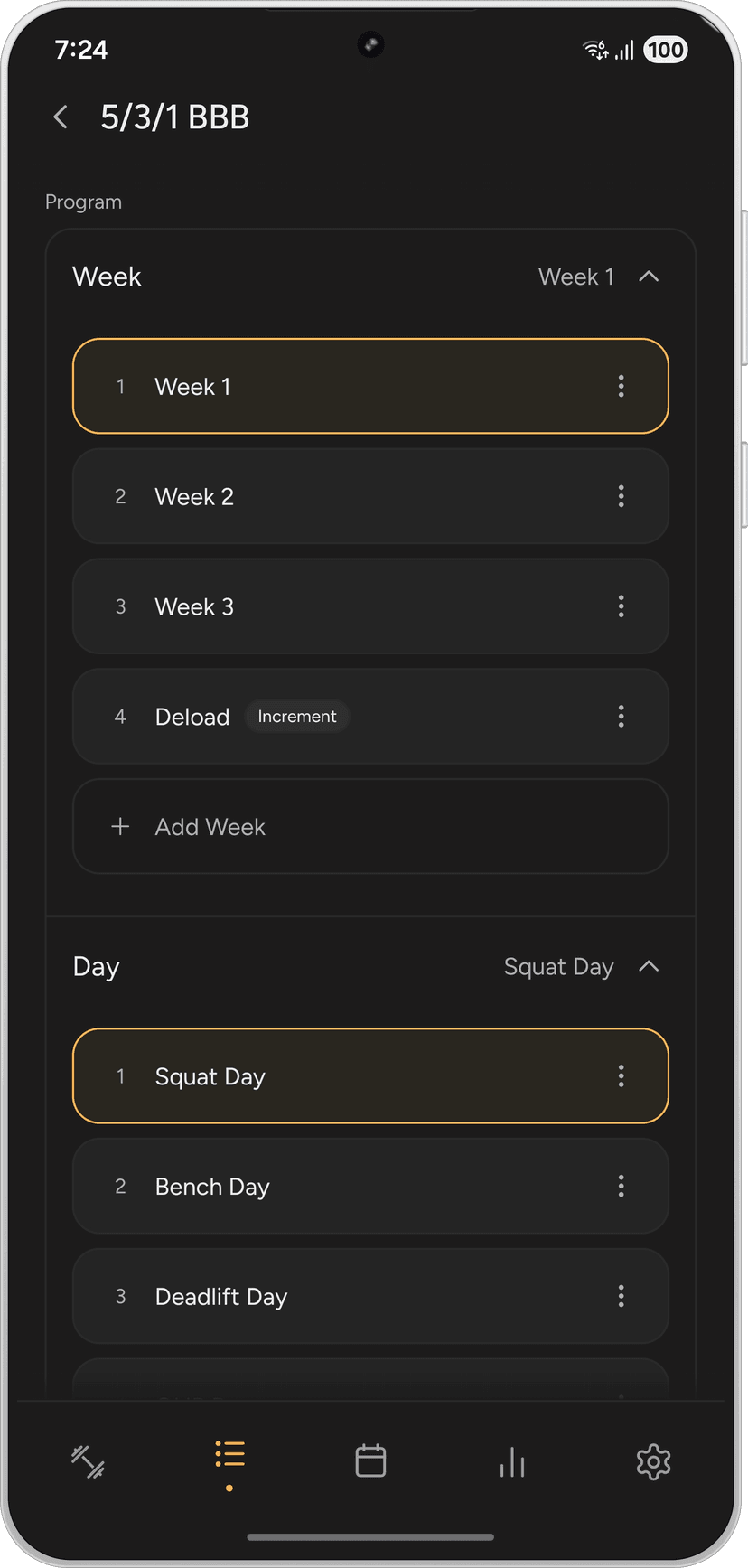 Crea rutinas personalizadas con control total sobre semanas, días, ejercicios, secciones y series. Duplica cualquier cosa para crear variaciones rápidamente.