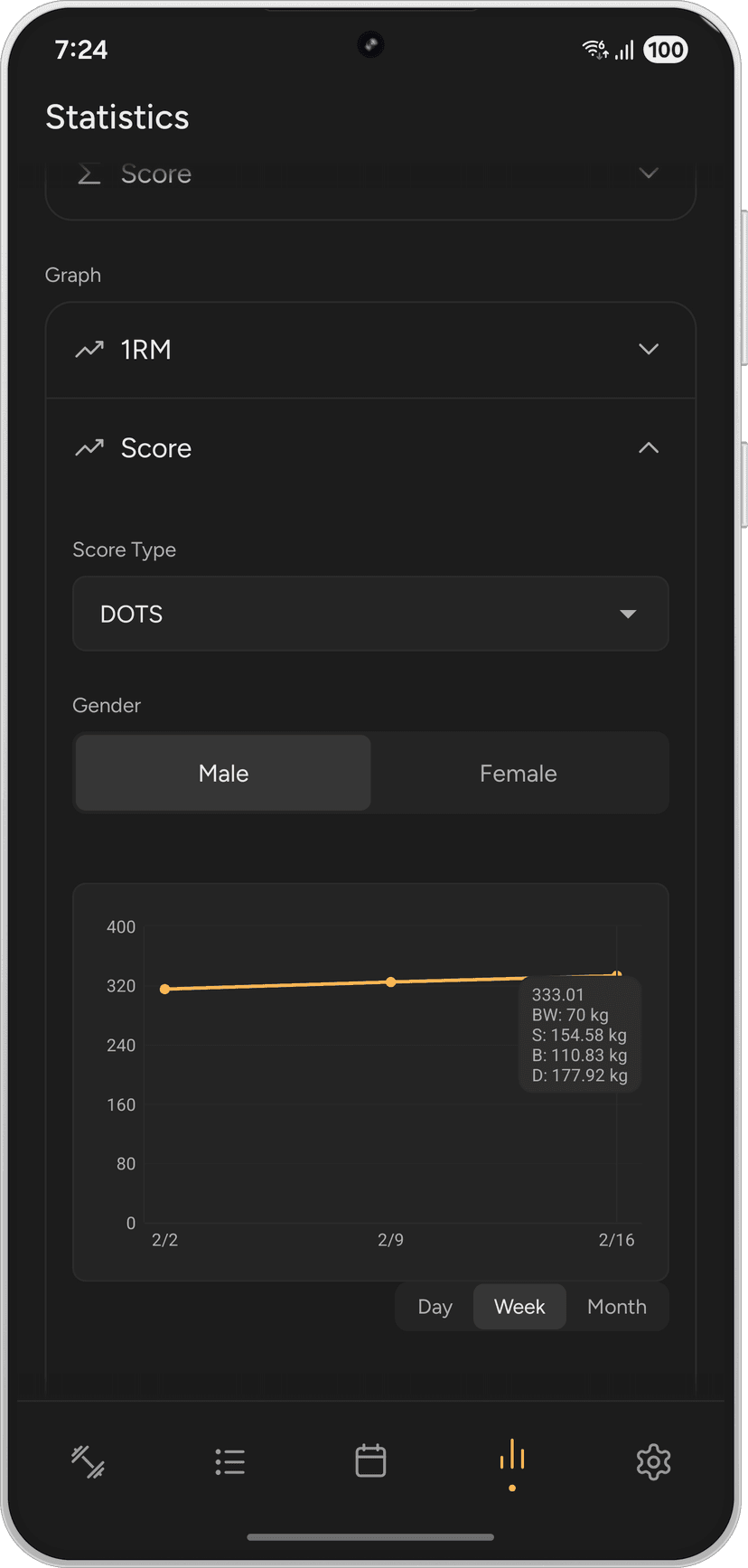 Calculadora de 1RM con 7 fórmulas. Calculadora de puntuación de powerlifting (IPF GL, DOTS, Wilks). Gráficos de progreso para 1RM, volumen y puntuación.