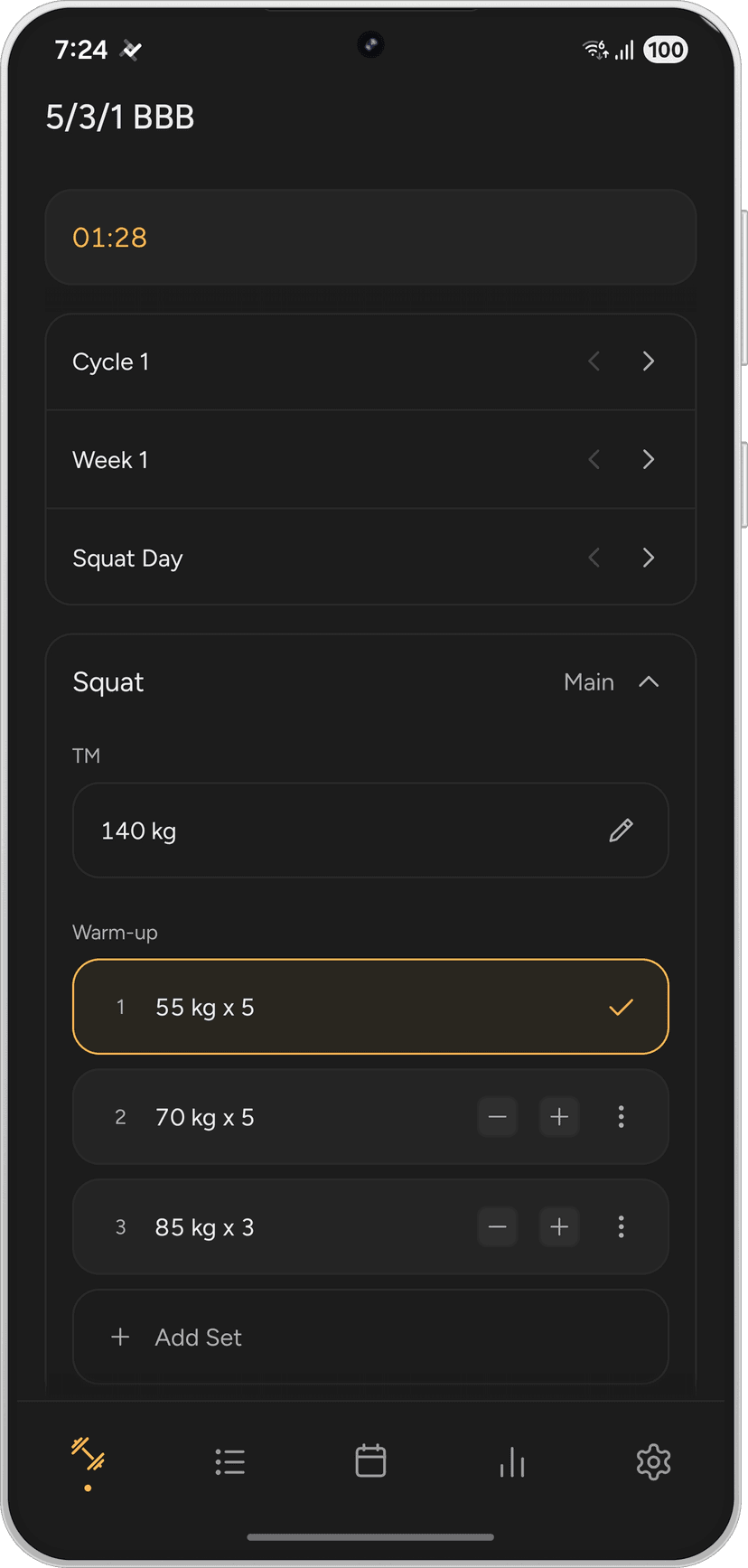 Los pesos se calculan automáticamente desde tu máximo. Sigue los números y toca para completar cada serie. El temporizador de descanso se inicia automáticamente con cuenta regresiva y alarma.